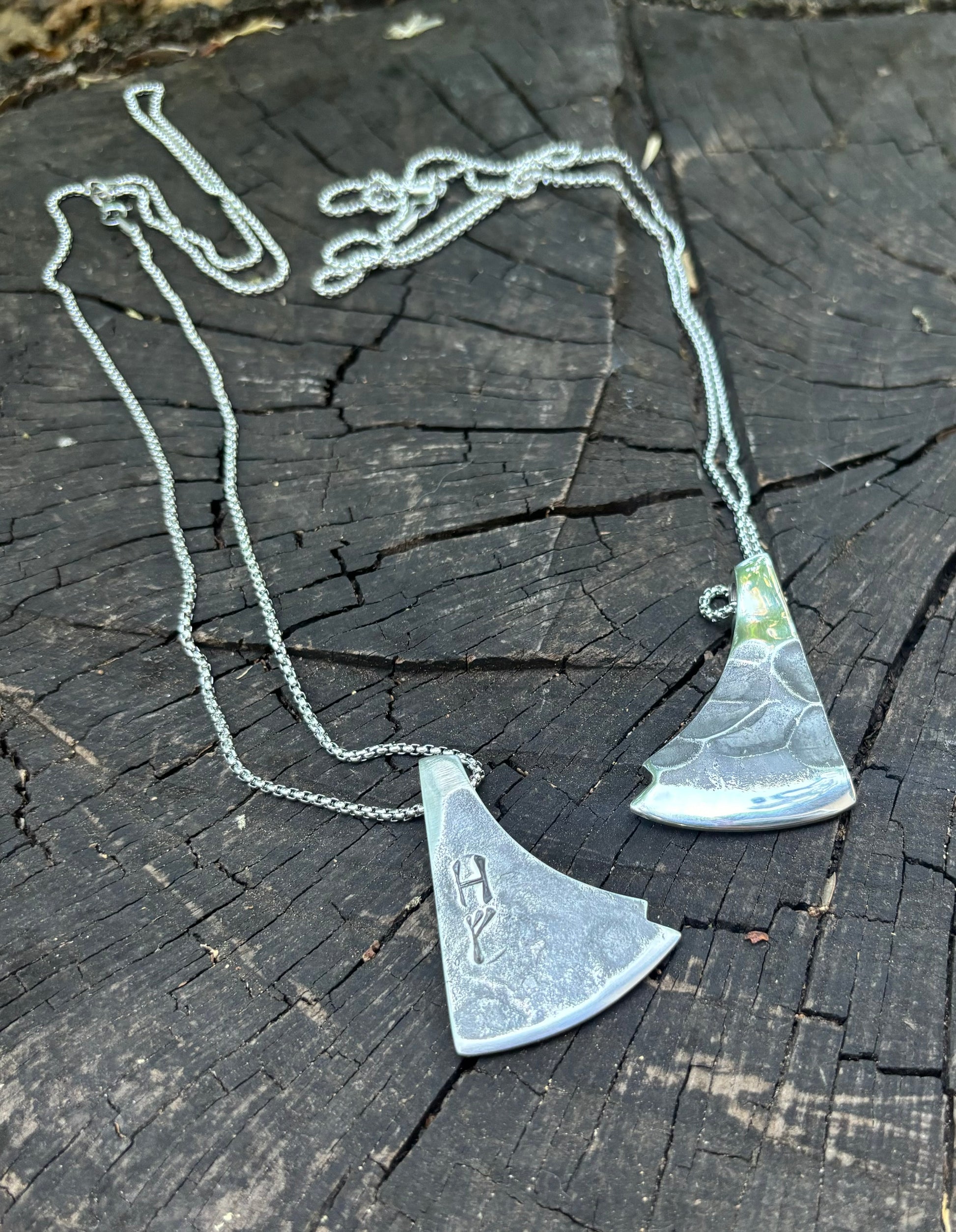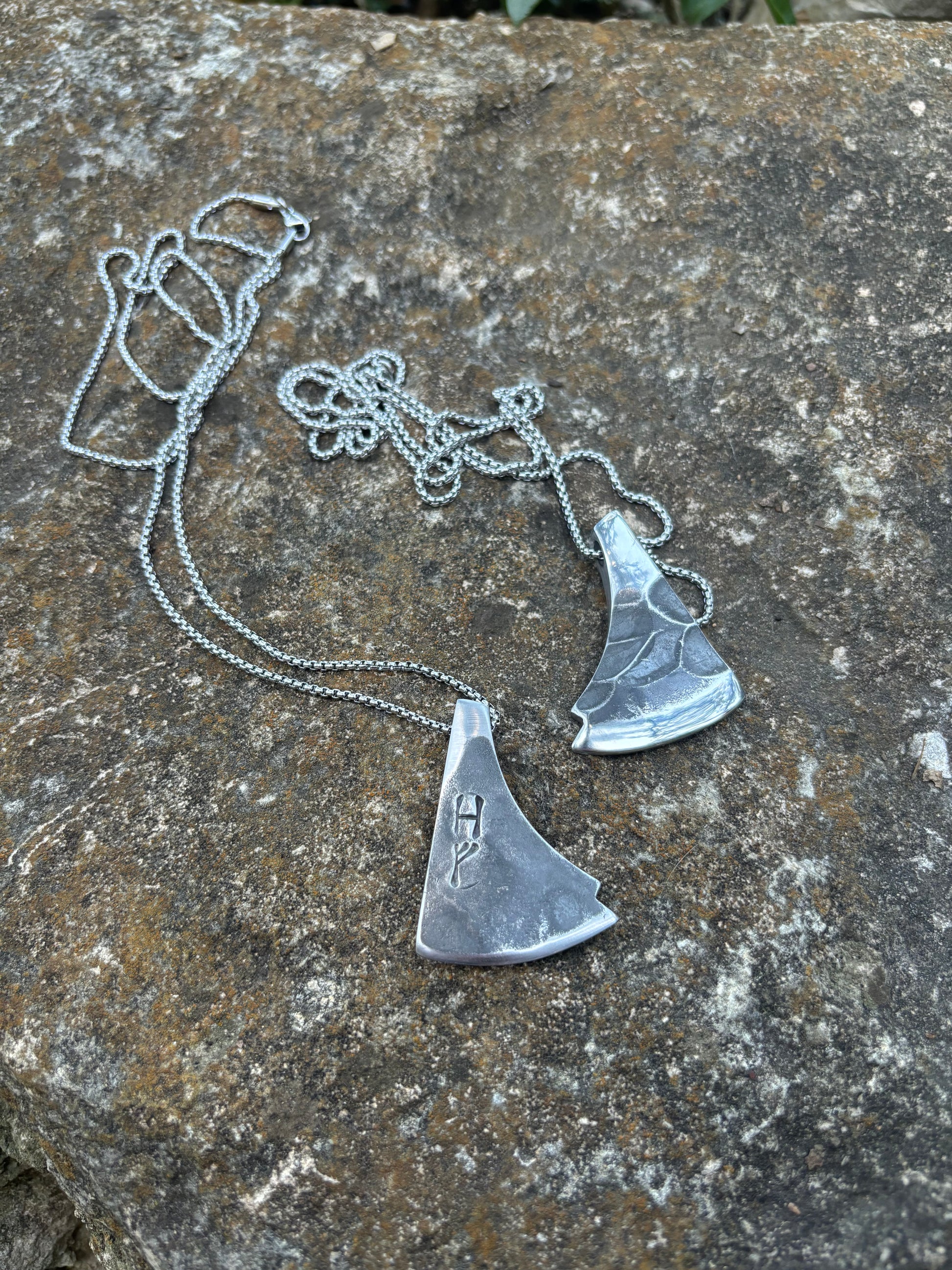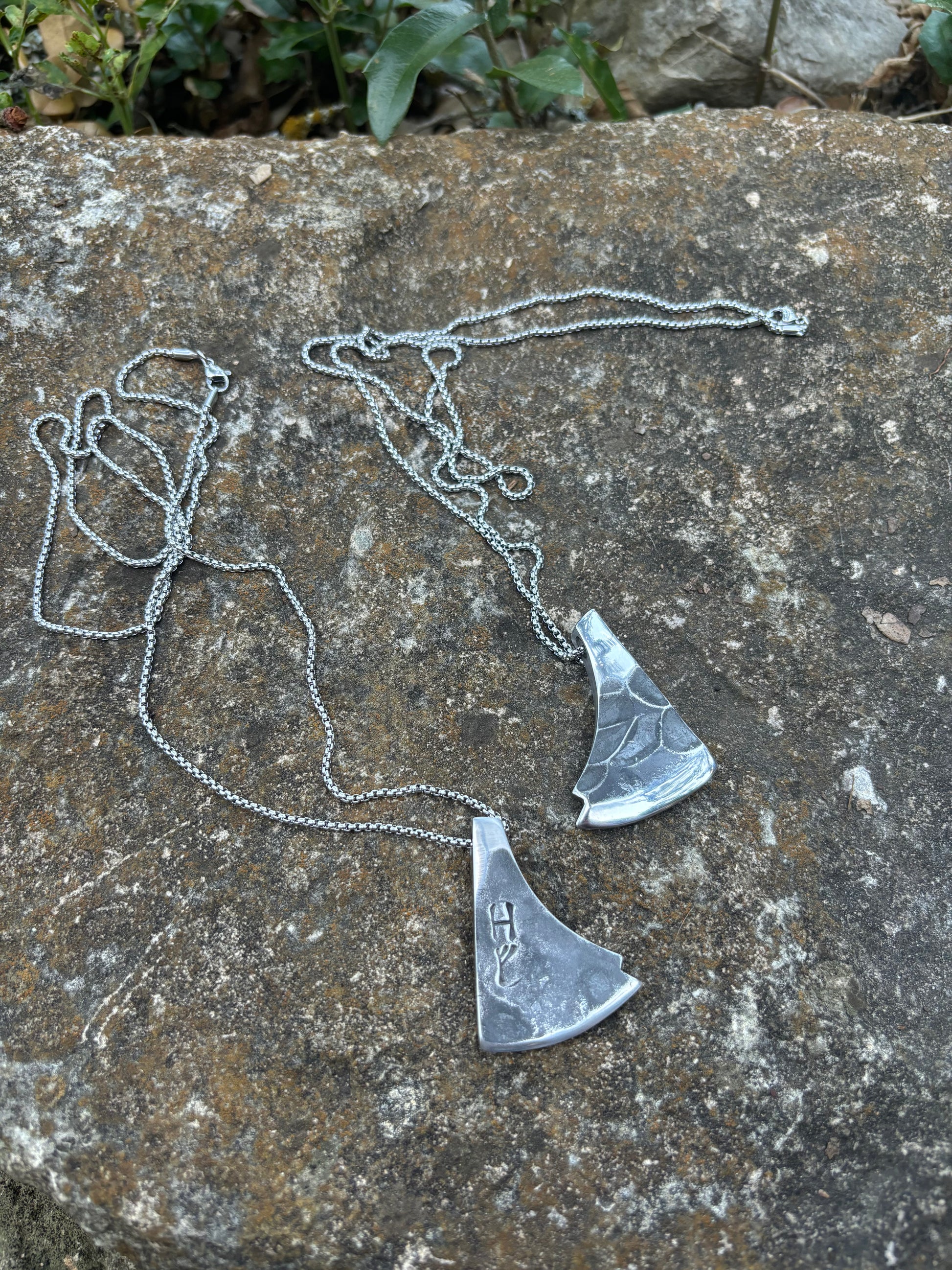 Forged (304L) stainless steel axe-head pendant worn by The Shattered Shields in the book “The Godblade”.