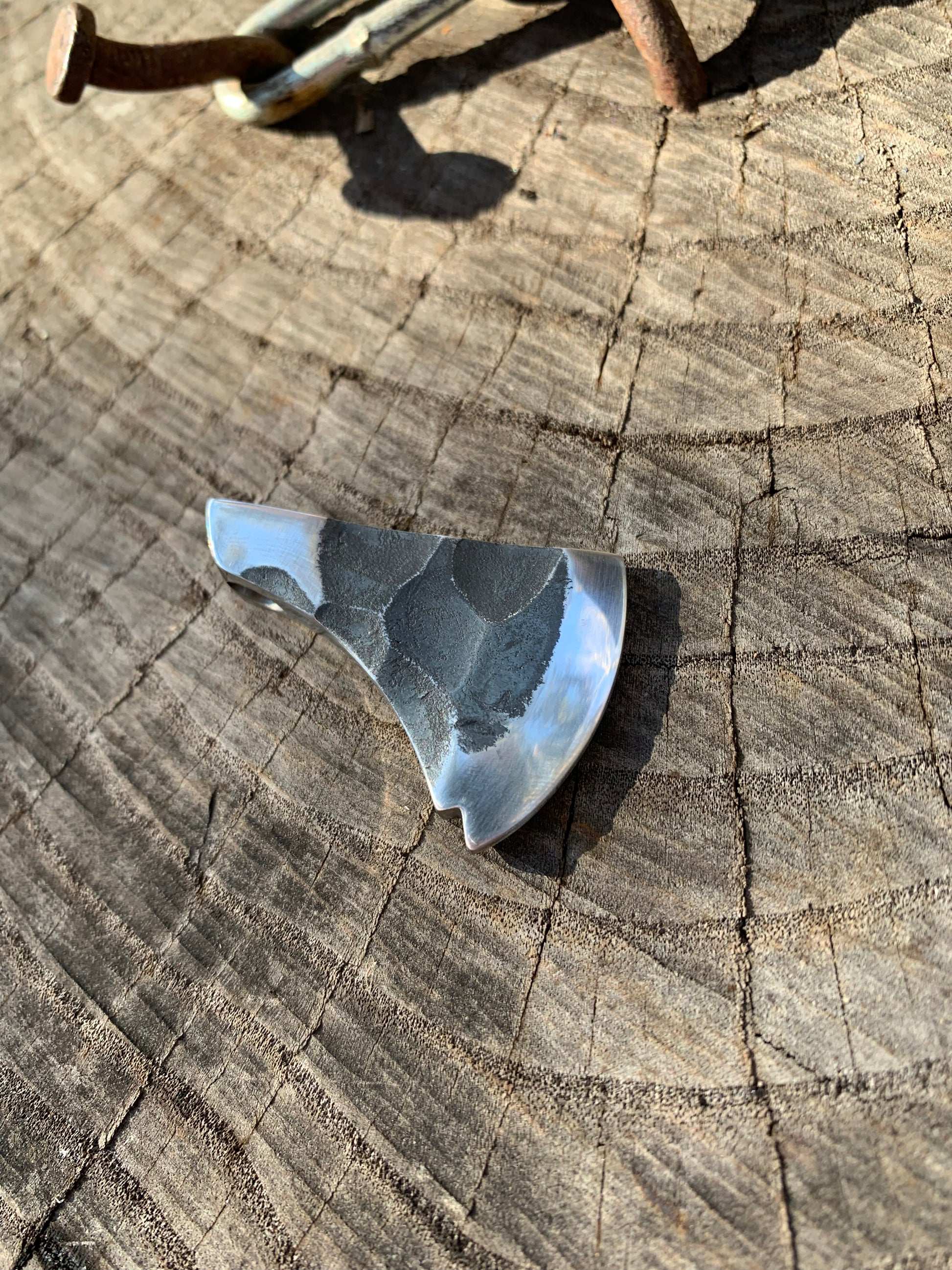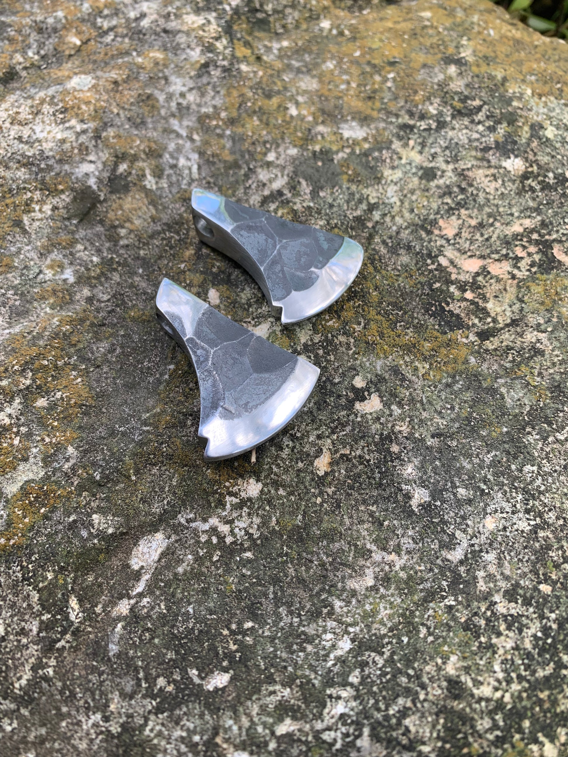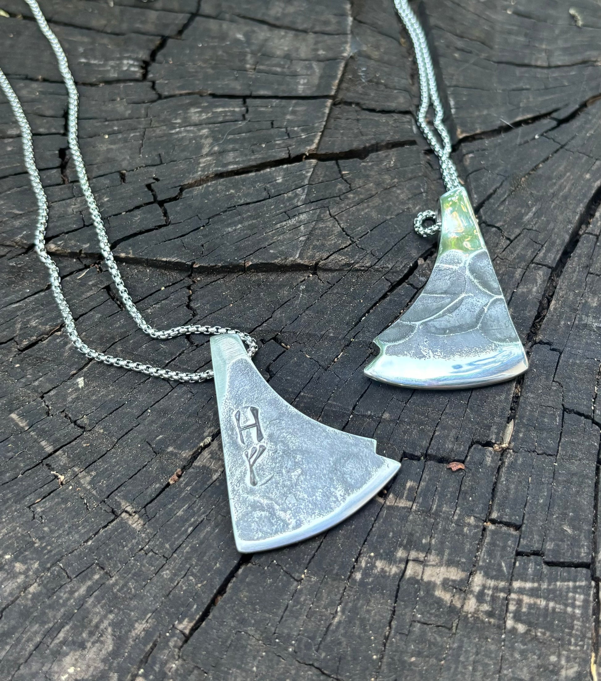 Forged (304L) stainless steel axe-head pendant worn by The Shattered Shields in the book “The Godblade”.